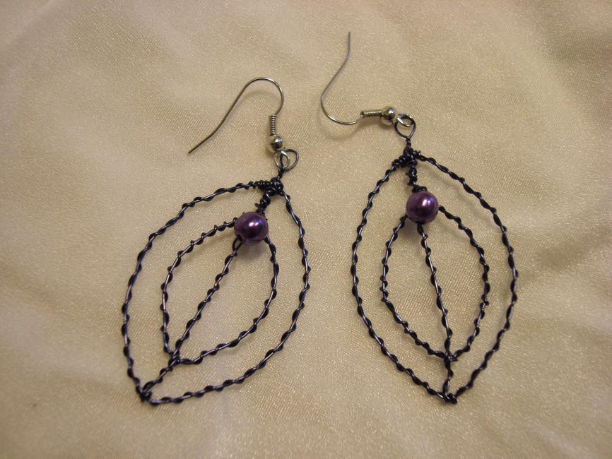 Blingfitteörhängen i mörkblå koppartråd med lila pärla. 155 kr för liknande.
