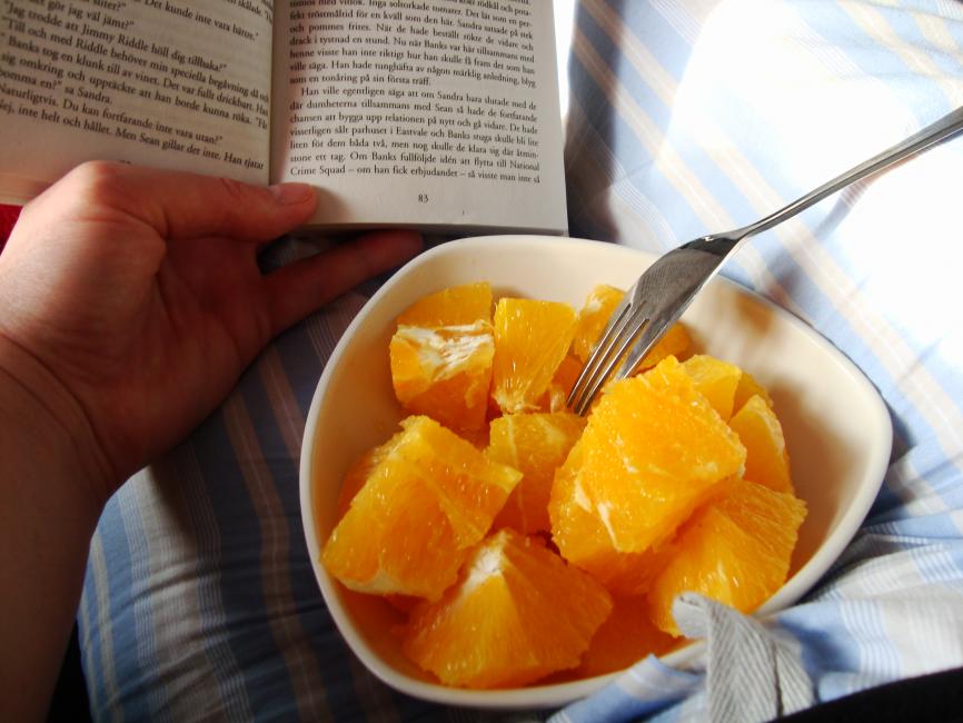 Sittandes i soffan, läsandes en deckare iförd pyjamasbyxor, med en skål apelsin i knät och lyssnandes på