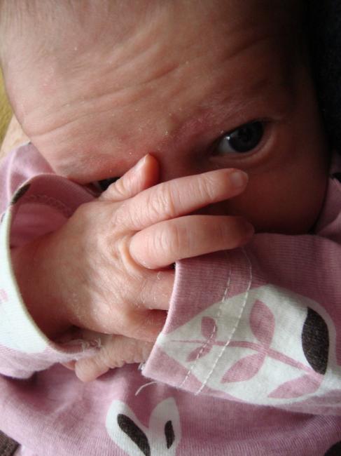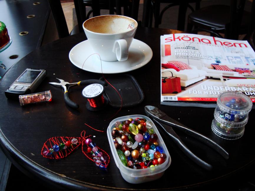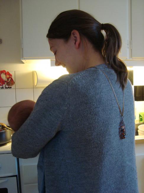 Skulle efter frukosten få träffa en tvåveckorsmänniska. Ville förstås komma med gåvor. Den lille sonen skulle få en färgglad mobil och modern skulle få en halsbandsberlock. Diskplockaren tittade fascinerat på. Torkade bordet bredvid två gånger.