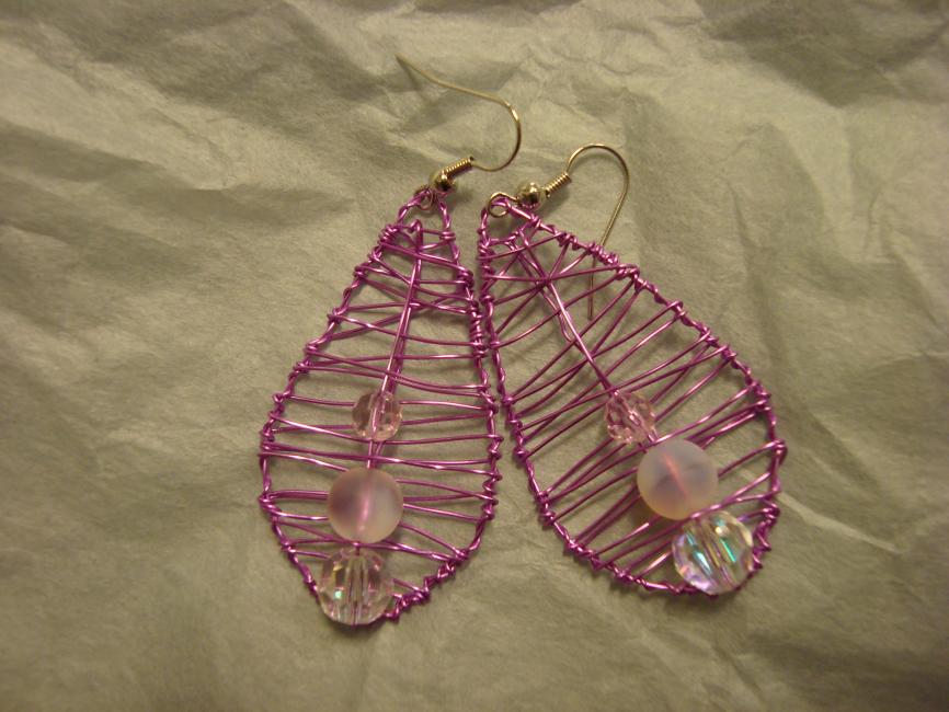 Örhängen i ljuslila koppartråd med återvunna glaspärlor i mjölkvitt, rosa och genomskinligt glas.