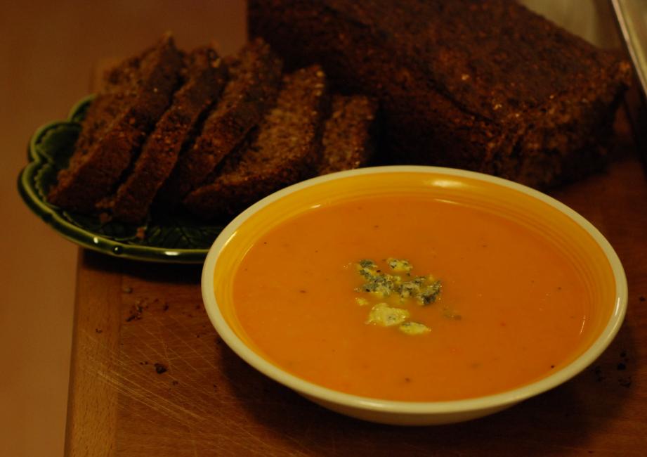 Apelsin och lime-doftande morotssoppa med smulad ädelost on top, och nybakt bröd till det. Ibland blir man så nöjd med sin matlagning att man måste skryta om den. Måste. Jo, jag måste!