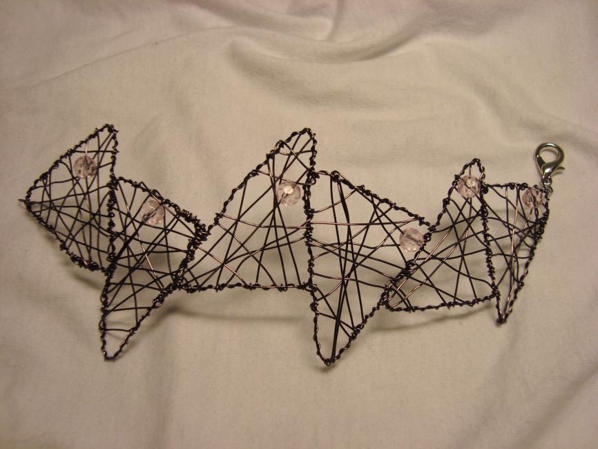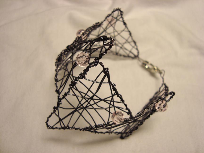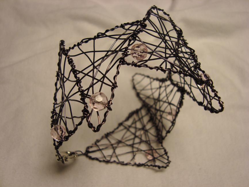 Armband av grålila koppartråd med ljusrosa facetterade glaspärlor. 349 kr.