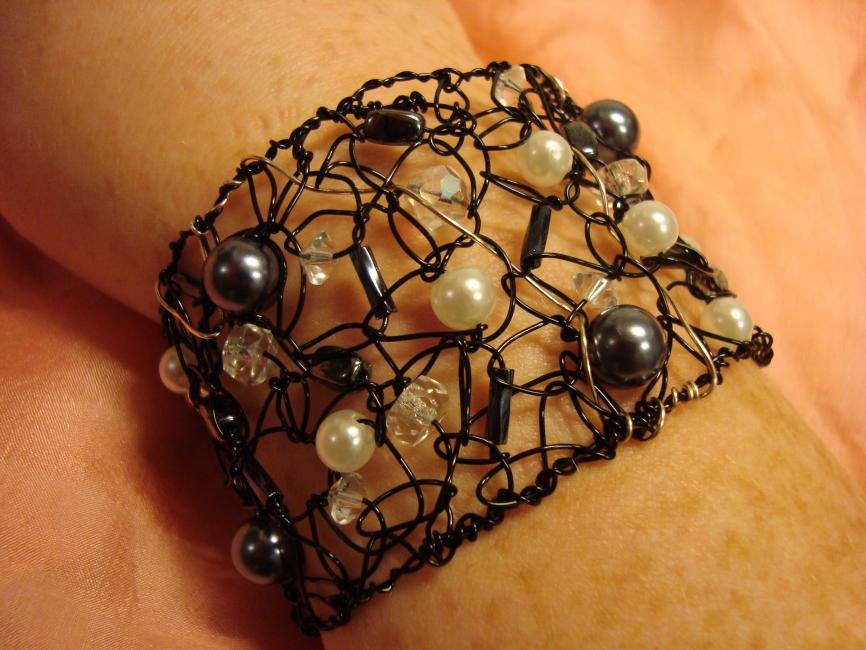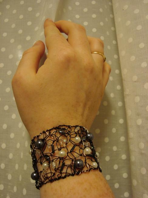 Armband i svart- och silverfärgad koppartråd med pärlor i metallic, pärlemo och glas. Detta är beställningsjobb men liknande detta kostar 349 kr.