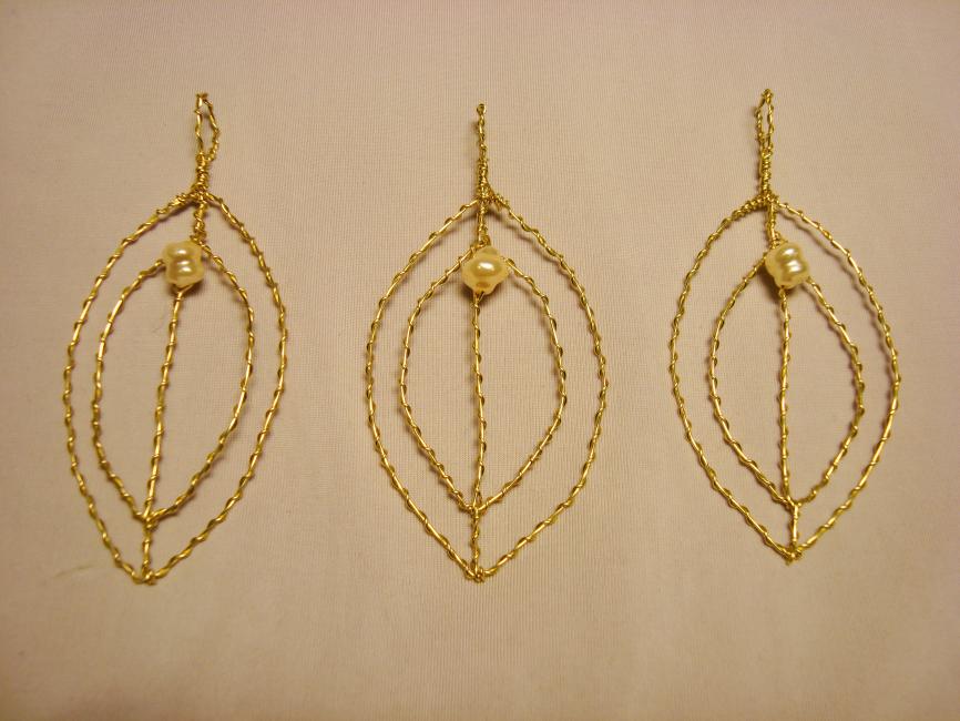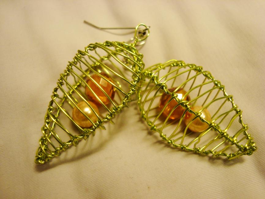 Burörhängen i guldgrönt och pärlor i nyanser av bärnsten och pärlemo.