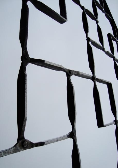 En kvart till affären öppnar. Portarna är stängda men grinden står på glänt. Regnet regnar både på mig och grinden. Och på kameran när jag riktar den uppåt och knäpper av.