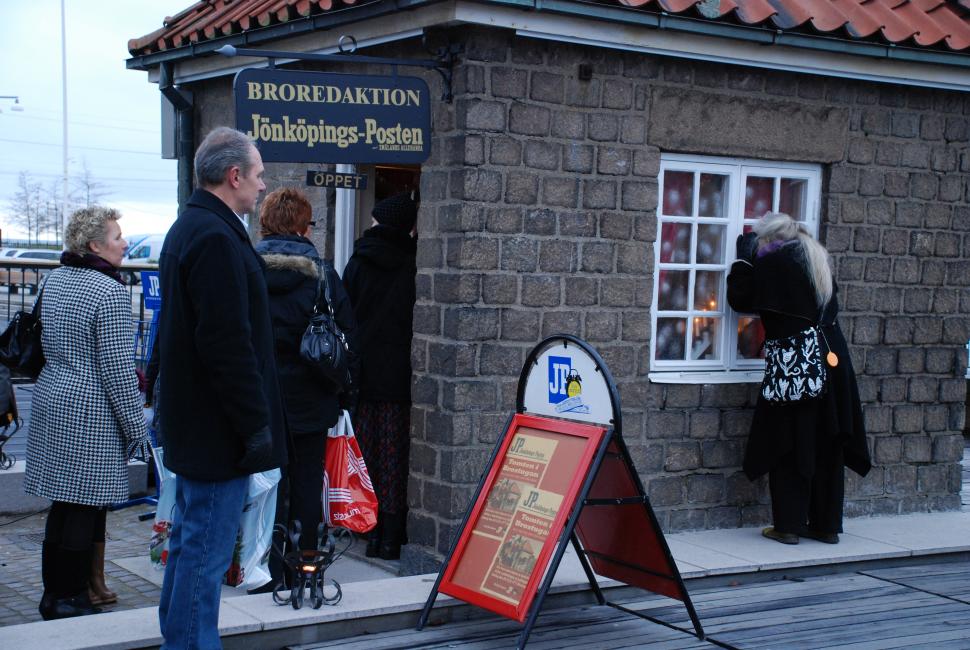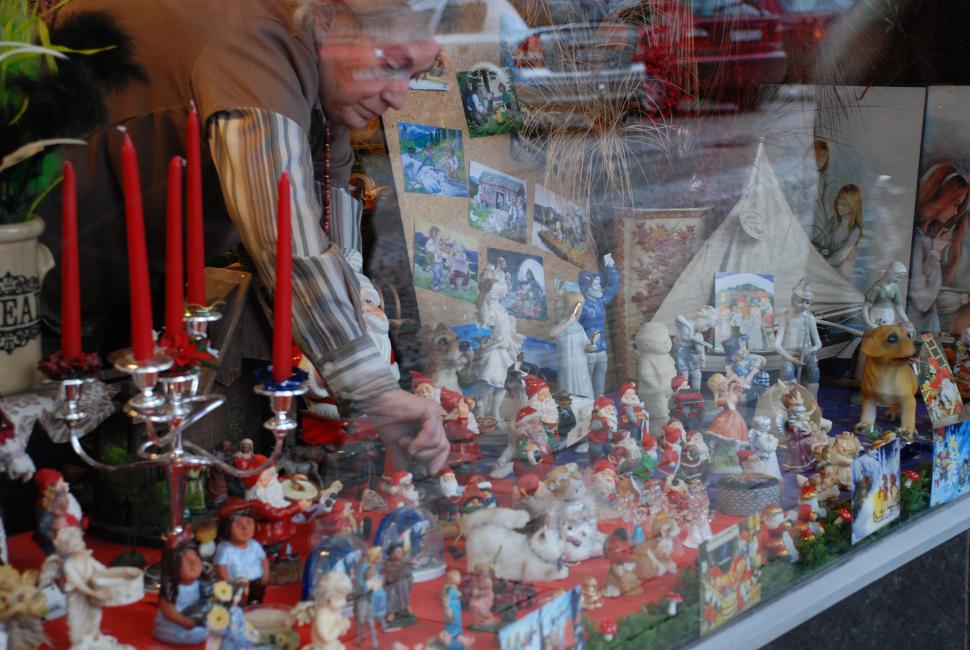 Hon ler mot tomtarna, tittar på lottvinsterna och försvinner sedan in i en port.