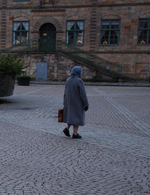 Jag följde med kamerans zoom, varje steg hon tog över torget.