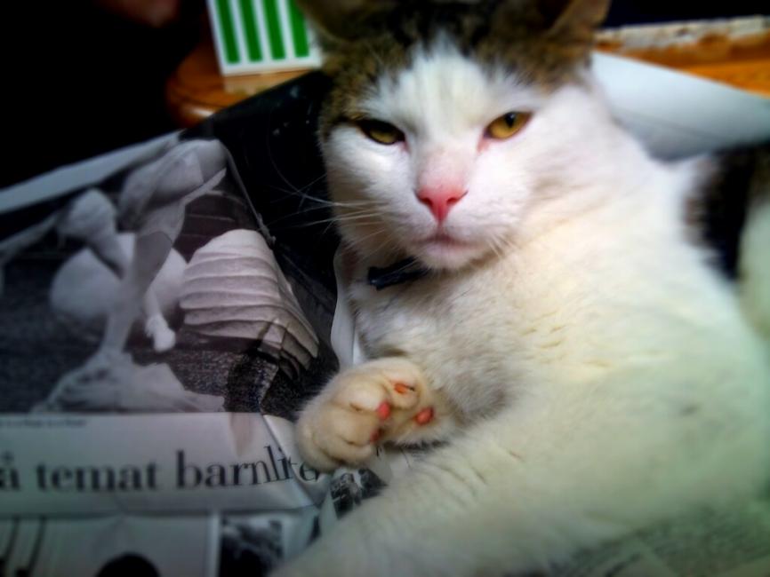 Sånt här händer då aldrig hemma hos mig! Att man får tidningen bestulen av en kisse som alltid måste vara i centrum av allt. Jag har ändå ingen tidning att stjäla.
