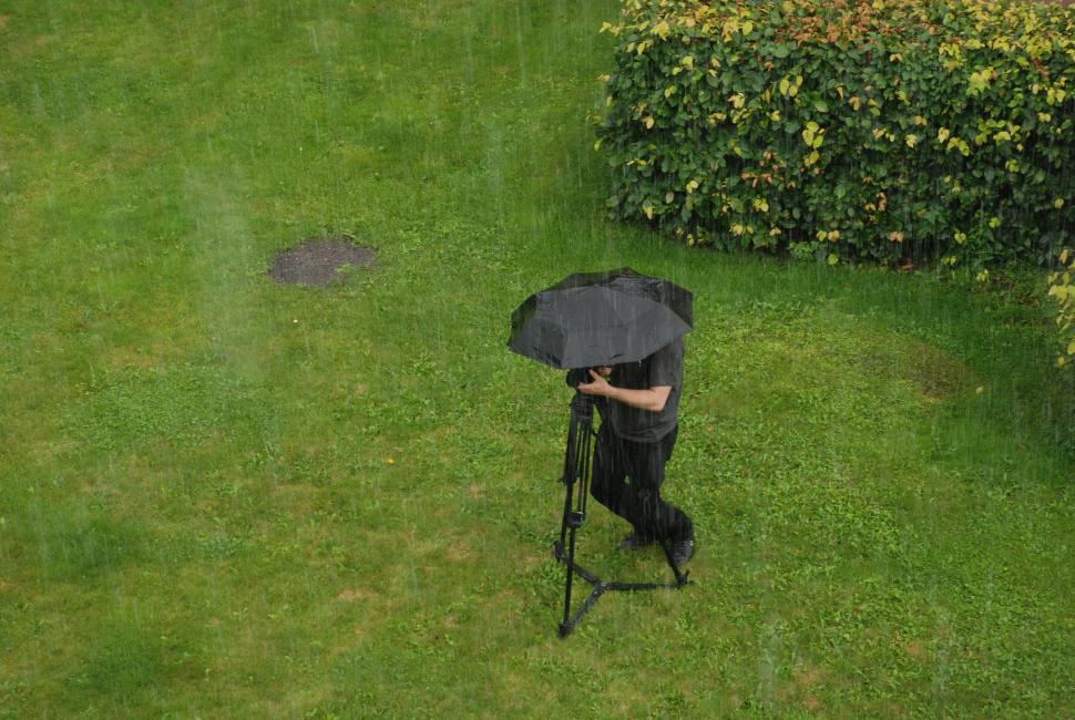 Våghalsen David skyr inga medel när han ska fånga ljud och bild, så i ett regn som skulle kunna välta en... eh... mindre jycke, stod han lika stadig som stativet han lutade sig mot.