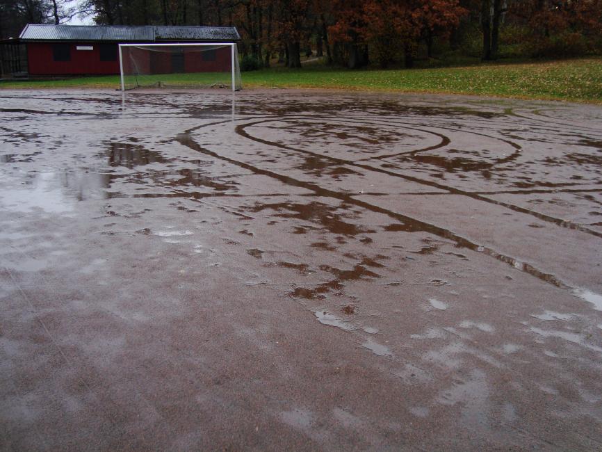 Glömde paraplyet. Håret var redan blött efter dusch så det gjorde inte så mycket. Blev bara ännu blötare. Var ute i sista minuten. Varje meter räknas. Även de metrarna som ligger under vatten på en grusplan.