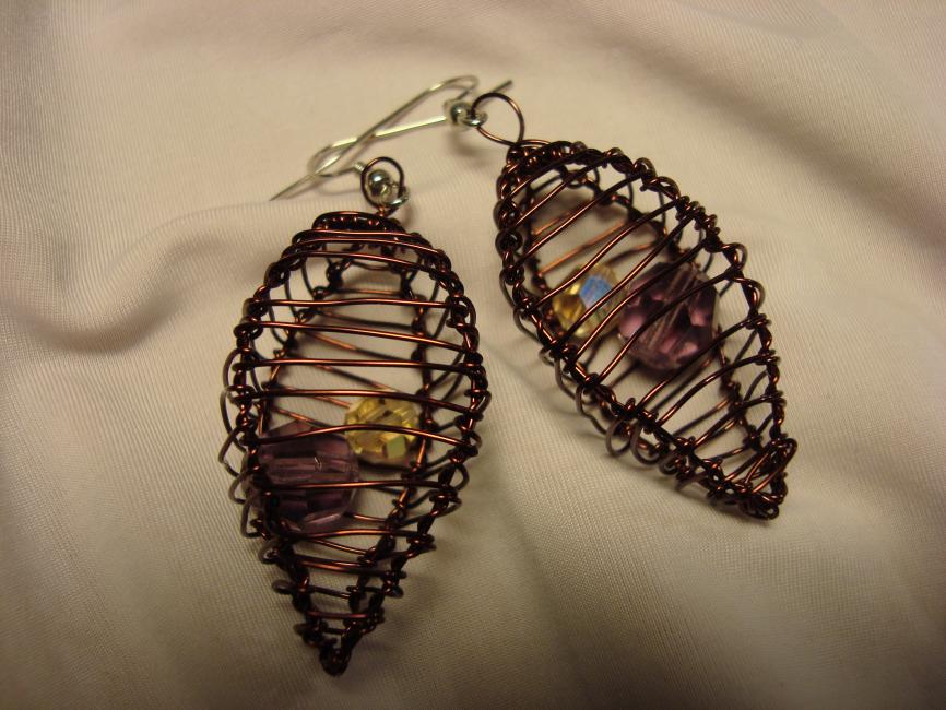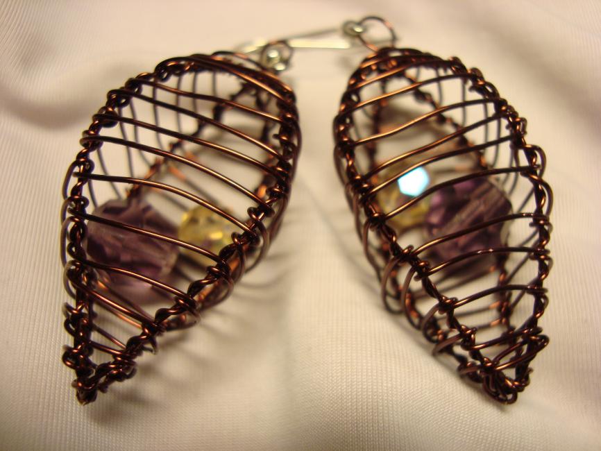 Burörhängen i brunfärgad koppartråd med pärlor i plommonlila och champagne. 250 kronor paret.