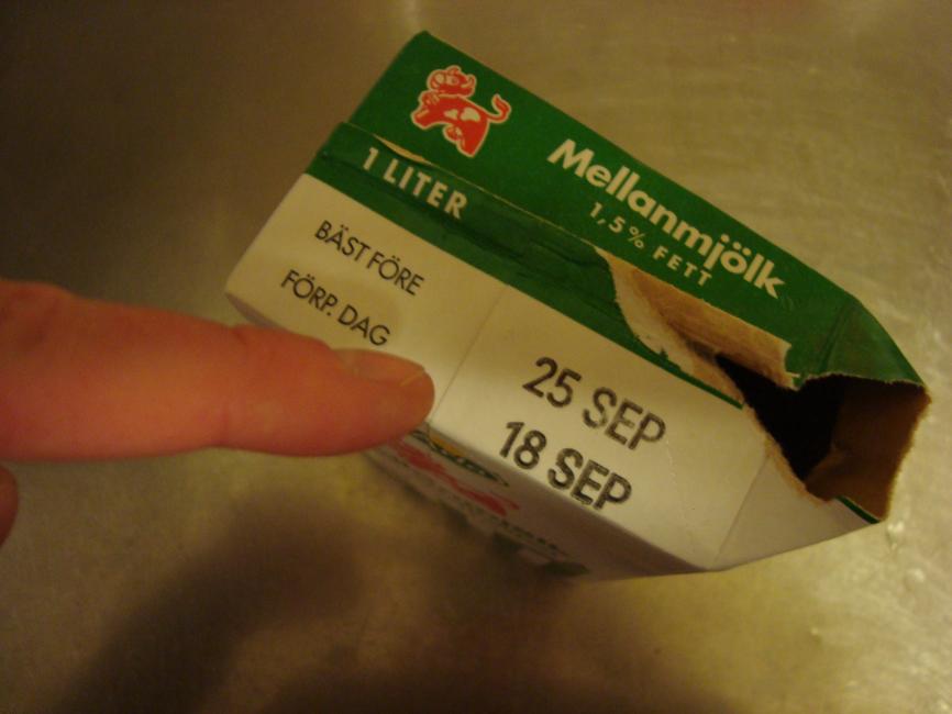 Kom till min lägenhet sent igår. Var trötta och orkade inte gå till affären och köpa mjölk. I kylen fanns en oöppnad mjölk med utgångsdatum 25e september.