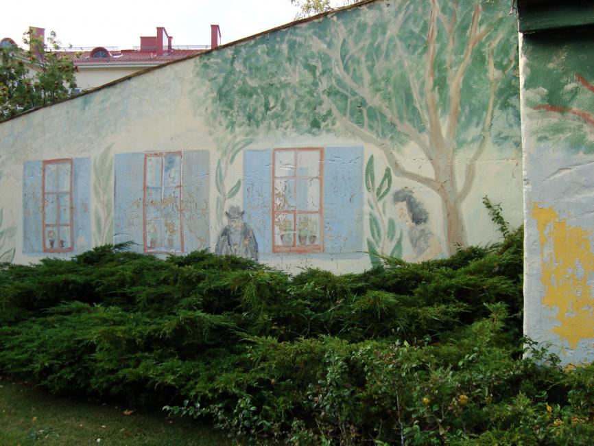 När jag var fyra träffade jag Johanna där. Hon var bara tre år och hon hade dagmamma i grannhuset. Vi blev bästisar då, på den gröna plätten framför väggmålningen, och vi är bästisar än idag.
