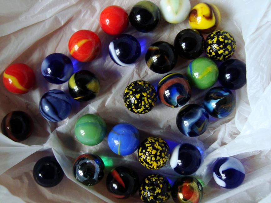 Fina porslinsskålar och fat med lövmotiv, små söta kaffekoppar i glada färger och så en påse med vackra glaskulor som jag kan stoppa i berlocker.