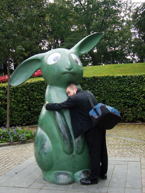 Stackars kaninen verkar inte vilja bli kramad. David ser behovet och ger kärlek.