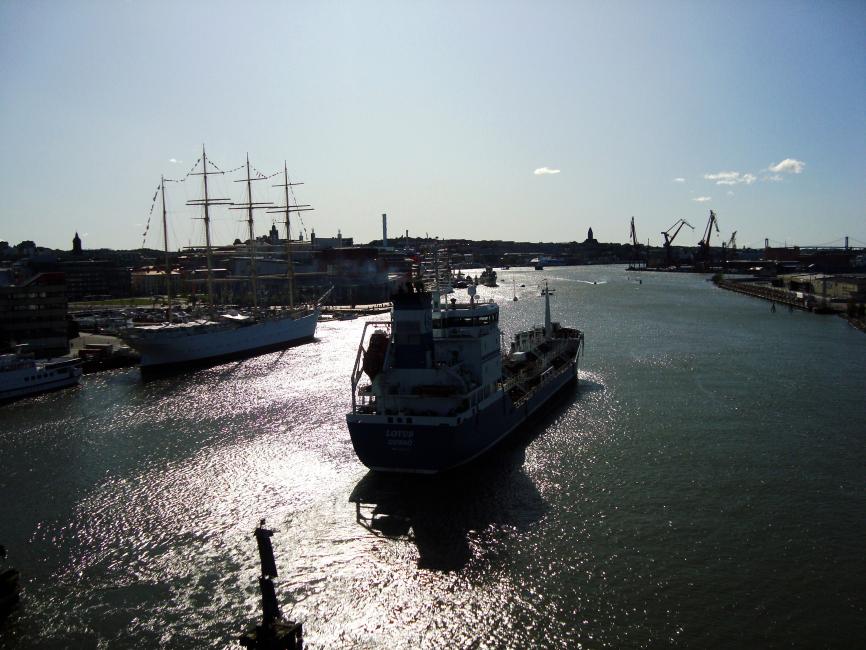 Vi stod i höstsolen och tittade på broklaffen som lyftes och lyssnade på plingandet från bommarna. Jag var inte den enda som fotograferade. Fast jag slapp stiga ur nån bil för att få bra bilder. Det var ett stämningsfullt ögonblick. Bilarna stod tysta och väntade medan den stora båten tog tid på sig att glida igenom. Så fort kusten var klar och båten lämnat oss, släpptes klaffen ned igen och trafiken flöt på som vanligt. Som om inget hade hänt.