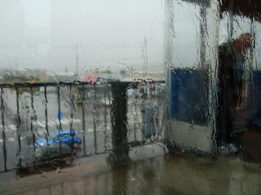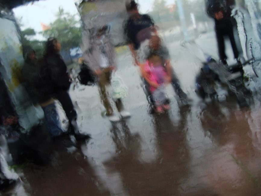 Vi hann in i vagnen innan regnet släpptes från himlen. Alla gjorde inte det. Hann, alltså.