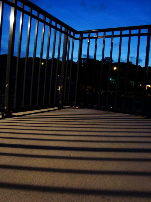 Gatlampans sken och balkongens räcke avslöjar tiden. Likt ett solur om natten. Ett månur utan måne. Snart somnar jag i ett rum som varken är mitt eller ditt. Journatt på ett nytt jobb. Sova enligt schema. Sova duktigt. Ska jag göra nu.