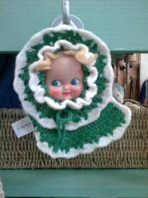 Var på loppis idag. Köpte INTE den här grytlappen med fastsytt dockansikte på. Tyckte liksom den var lite läskig. Dessutom undrar jag hur smart det är med plast i en grytlapp. Det känns ju inte som att smält dockansikte är den mest lysande smakhöjaren, om jag får säga vad jag tycker.