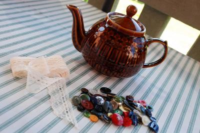 Fyll en påse för 10 kronor. Det är sympatiskt. På andra loppisar tar de en krona styck för knappar. Det är smått kriminellt enligt mig. Stod och grävde i knapplådan tills mor och David såg lite lagom uttråkade ut. Sen hittade jag lite fin spets också. Kan vara bra att ha. Precis som tekannan.