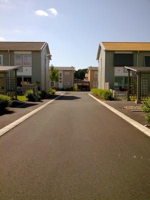Jag cyklar igenom det här bostadsområdet på väg till och från jobbet och blir lite rädd varje gång. Vem vill bo så här? Framför varje hus finns en liten altan och bredvid ytterdörren står det ett litet bord och två små stolar. På marken står en stor blomkruka med någon färgglad blomma i.