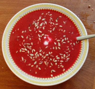 Jag hittade rödbetssoppa i frysen. Det gjorde mig glad. Strödde solroskärnor över och klickade lite filmjölk i mitten. Och så upptäckte jag hur fint det blev med porslinet.