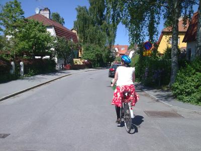 Cykelhjälmen jag fått låna var som cykelhjälmar är mest: svettig och jobbig. Men jag vågar inget annat än att ha den på huvudet när det ska cyklas i Stockholm. Vid bildens tidpunkt kändes det självklart att slänga fram mobilen och fota villaidyllen. En kvart senare var trafiken överallt, då kändes det inte vidare självklart längre.
