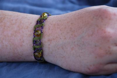 Armband av lilafärgad koppartråd med olivgröna glaspärlor och sidenband.