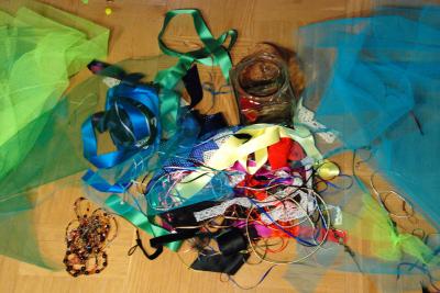 Överst: Armband av grönfärgad koppartråd och turkosblått sidenband med rosa pärla på. Underst: Armband av silverfärgad koppartråd med turkosblått sidenband och olika blå och rosalila pärlor.