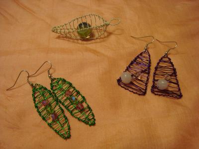 Gröna örhängen med rosa och mintgröna pärlor, Lila örhängen med lila pärlor och en vit kapselberlock med en spelkula inuti.