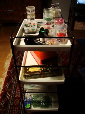 Har länge irriterat mig på att mina smyckesprylar liksom hamnar överallt i hela lägenheten. De har egentligen sin plats på en fin stringhylla i sovrummet, men eftersom jag aldrig gör smycken i sovrummet så har jag, fram till idag alltså, varit tvungen att flytta ut det jag behöver till vardagsrummet.