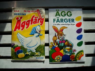 Den vänstra påsen med äggfärg köpte min mamma när hon bodde i Hässleholm någon gång i mitten av 70-talet. Den högra påsen är köpt nu i veckan.