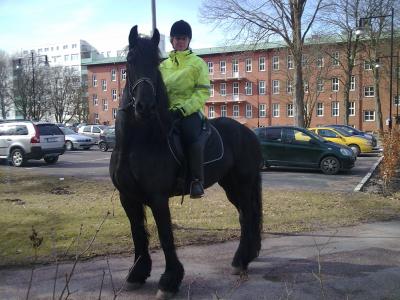 Tittar ut genom fönstret, det är snart lunch, magen kurrar, och vad nu? En häst på parkeringen! Och en neongul ryttarinna!