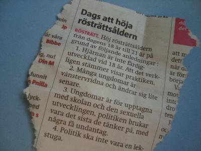 Skribenten anser att man bör höja åldern för rösträtt till 21 år, och som punkt två i listan över anledningar till detta har vi: "Många ungdomar är vänstervridna och ändrar sig lite senare."