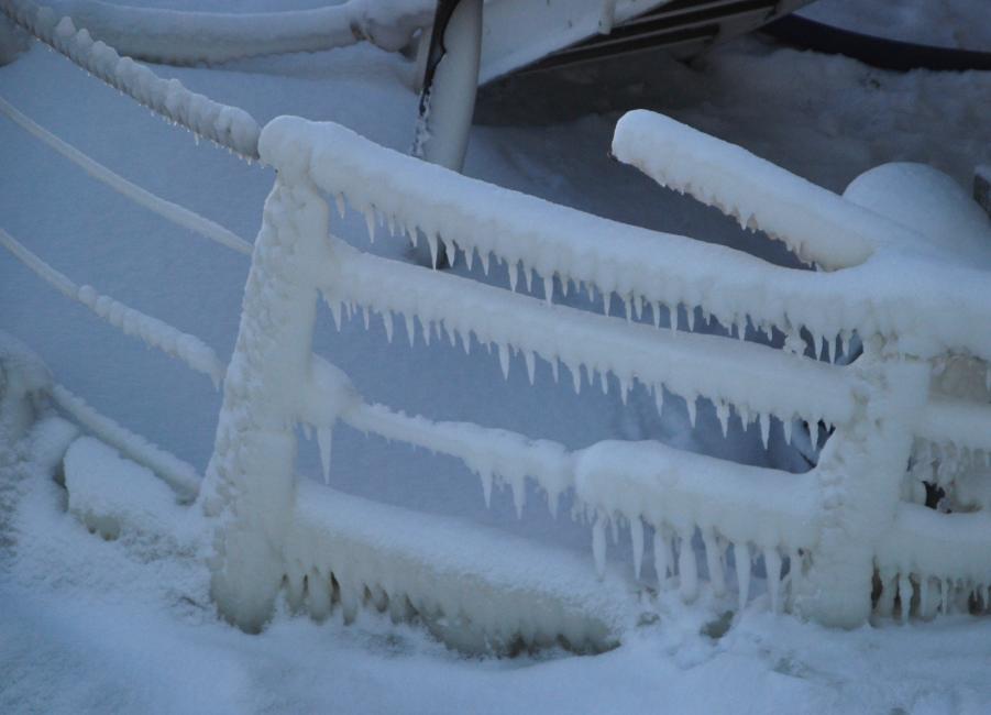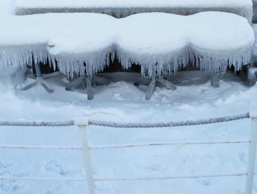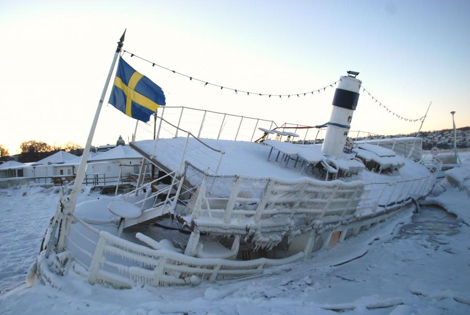 Längst ut på piren i Jönköping ligger båten Saltkråkan på ända. Iskalla vågor har svept över båten och fått bord och stolar att frysa fast på däck. Sommarens vita dukar har bytts ut mot långa istappar hängande från bordskanterna. Flaggan står i topp, som för att visa att även om hon har sjunkit så håller hon fanan högt. Bokstavligt talat.