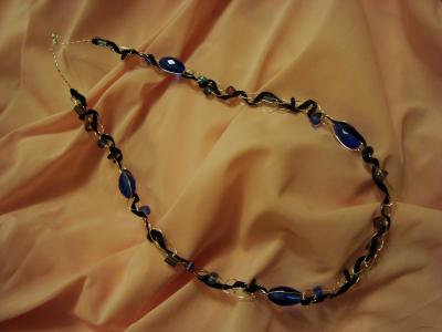 Halsband med olika nyanser av blått och ett inflätat svart sidenband.