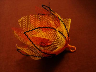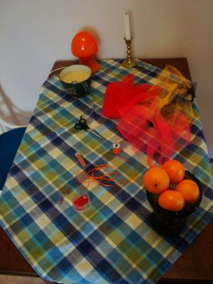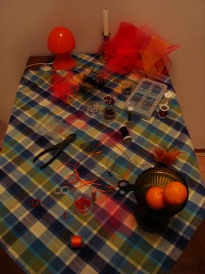 Tyll, sidenband, pärlor, sytråd, clementiner, svamplampa.
