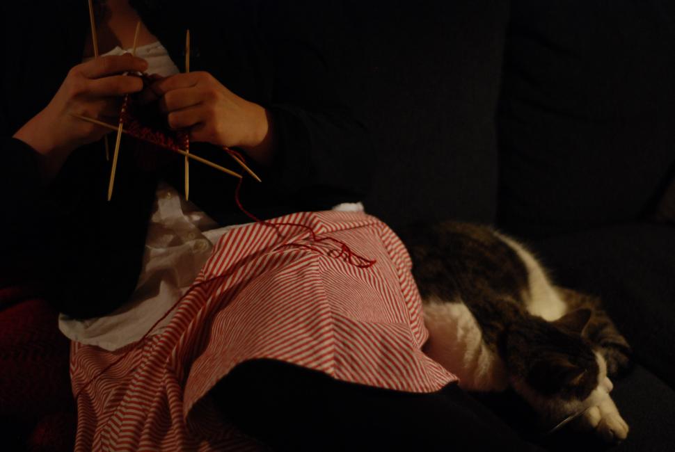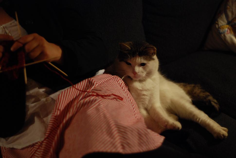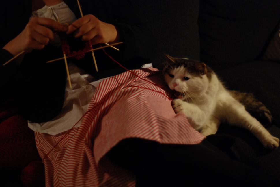 Systern stickar raggsockar till mig. Astor vill också vara med. Han vaknar upp från kvällens andra vila för att jaga tråd en stund.
