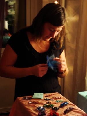 Igår dukade jag fram alla mina smycken i vardagsrummet, kex, frukt och nötter i köket - och sen kl 18:30 började det ringa på dörren. På grund av diverse sjukdomar som går, blev vi inte så många. Men trevligt blev det. Det tittades på smycken, åts muminkex, dracks lemonad och pratades konst, kultur, hantverk och inspiration.