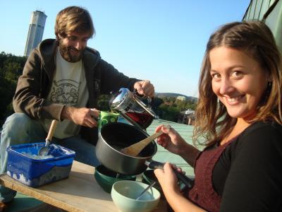 Ida och Christian bjöd på glass och varm äppelkräm uppe på taket. Det kändes som den perfekta, oplanerade, lördagssysselsättningen.