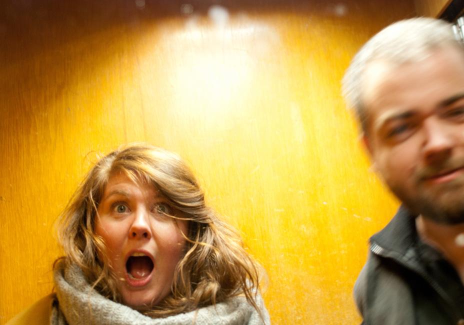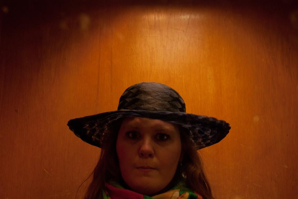 I vårt hus finns en gammal skruttig hiss som låter olika varje gång man åker i den. Den är pytteliten och har gulbruna träväggar.