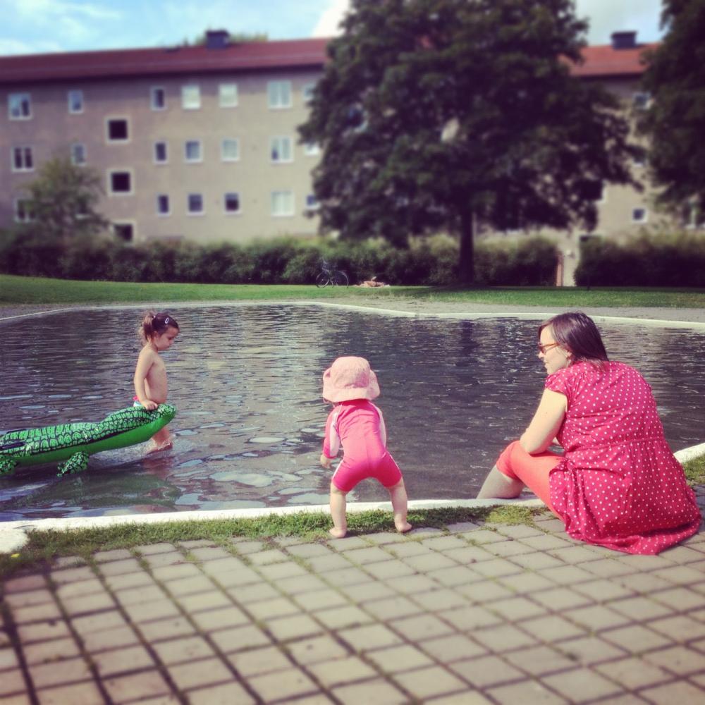 We went to the wading pool and Hilda thought the water was cold but the girl with the plastic crocodile was cool.