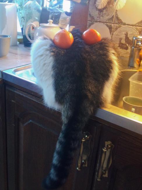 När Astor har hittat nåt ätbart i diskhon kan man placera till exempel clementiner på hans rumpa utan att han märker nåt. Himla praktiskt.