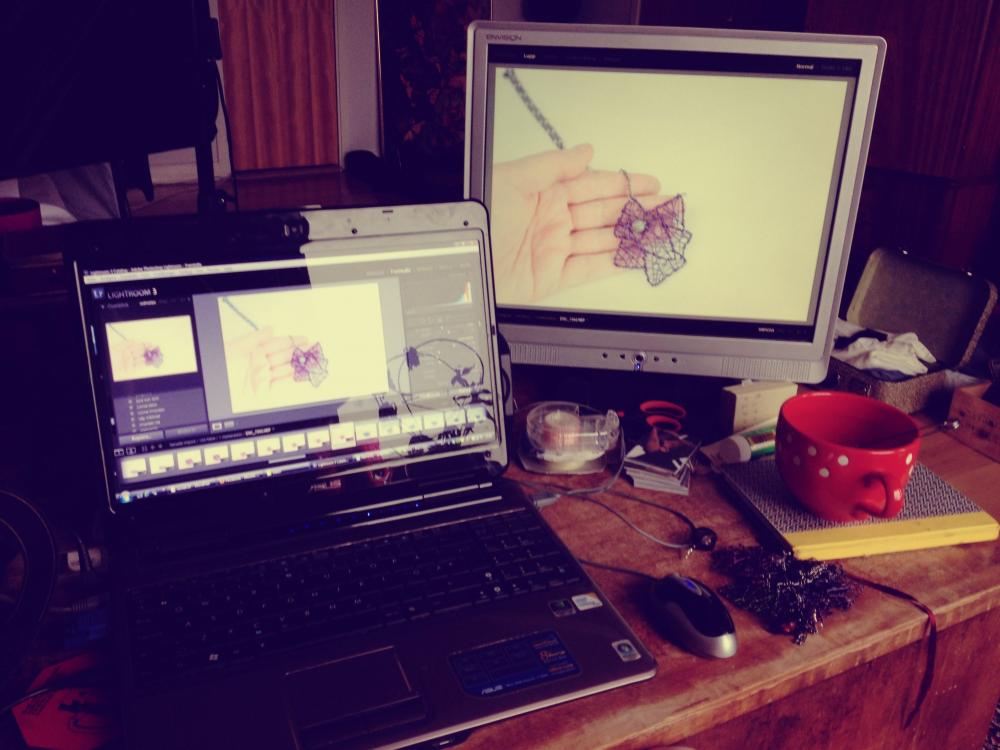The second glimpse is of my messy desk. Kind of how it always looks. Lots of stuff cluttering the edges of the desk space while I'm working on editing photos of jewelry to be listed in the etsy shop and then, of course, the mandatory large tea cup never leaving my side.