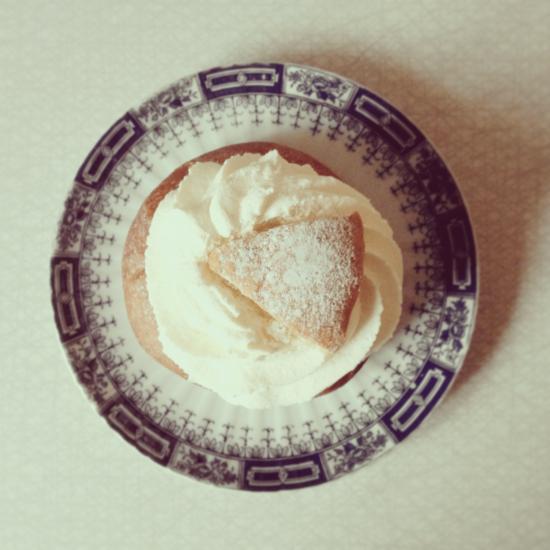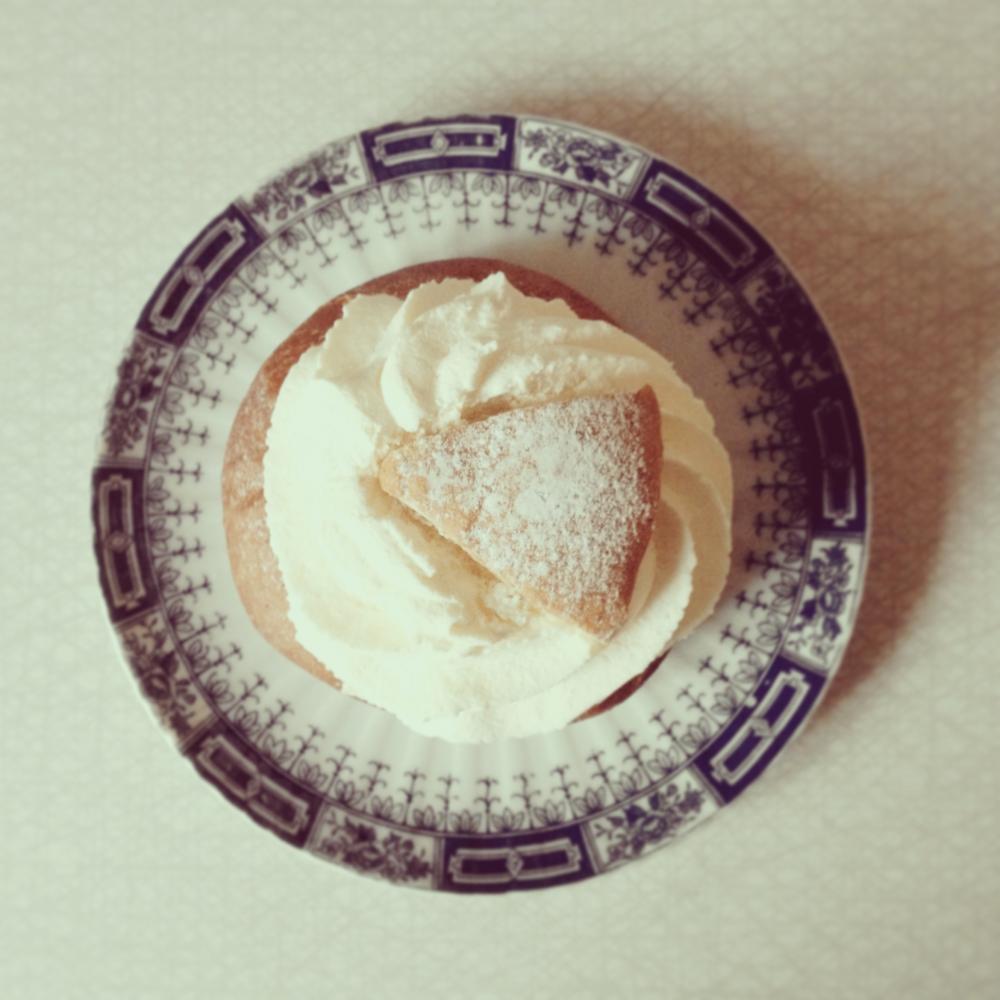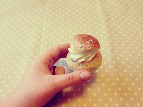 A semla is a swedish traditional sweet roll. It's stuffed with almond paste and then under the little hat lots of whipped cream. We eat it every year at this time until easter. It's really tasty and every year swedish cities have competitions deciding where they make the best semla and then everybody goes there and stand in line to eat the best semla the city has to offer. It's all very cute.
