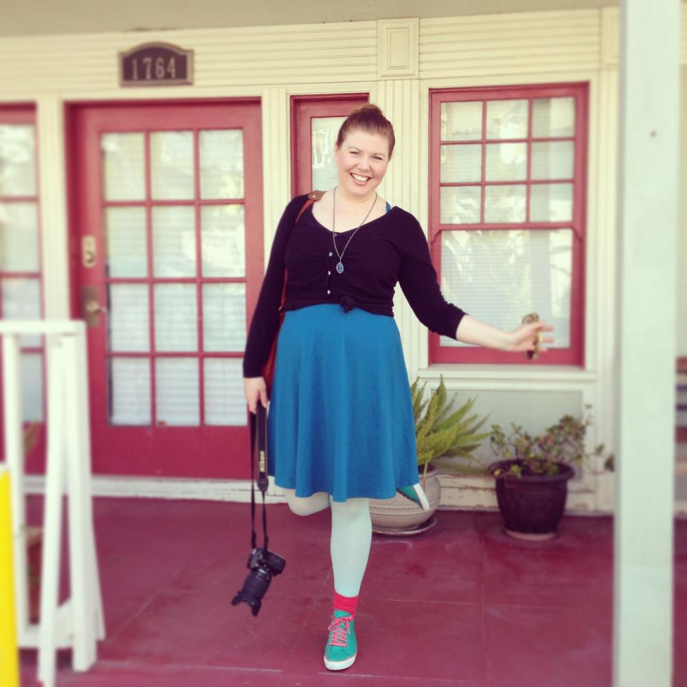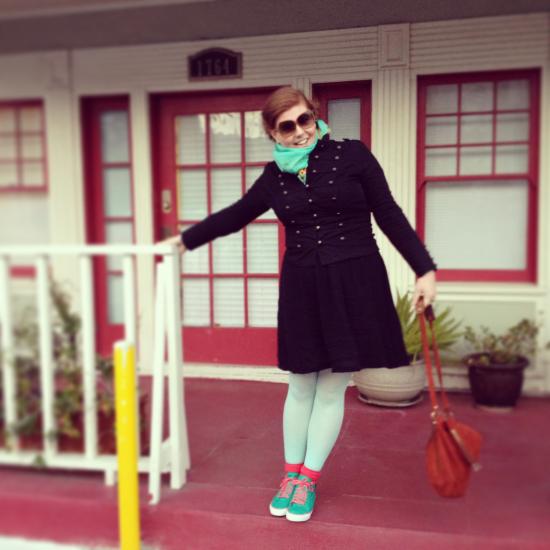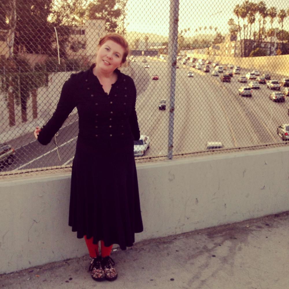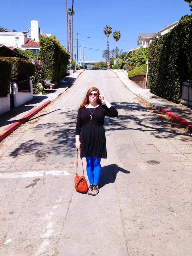 Pale but happy. Black dress and blue tights. In Sweden I get noticed when I wear these blue stockings. In Hollywood: not so much.