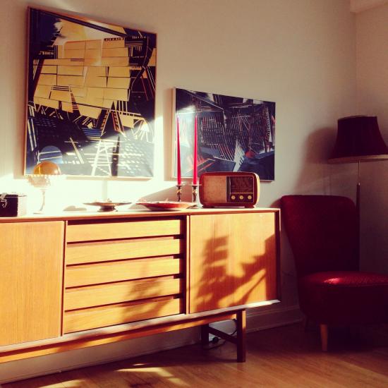 The first one is of the living room and my favourite corner. The paintings are made by my grandfather. I love his work so much and think these two ships looks so nice there. And I like how the model ship made by my uncle casts its shadow over the sideboard, like it knows they belong together.