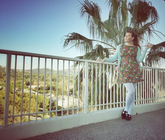 Taken with self timer on our hotel balcony. My absolute favourite vintage dress got to come with me to LA. The "Flowerbed dress", as I call it. Perfectly matched with mint cardigan and tights and I was a colour explosion ready for the day.