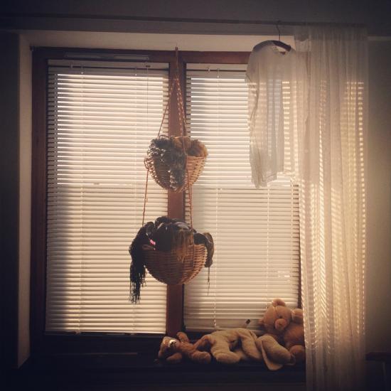 Bedroom window in evening light. I love the light through the blinds at that time in the evening. The stuffed animals don't usually hang out in the window but I'm thinking it looks kind of sweet. Maybe a bit like a kids room but I don't care. I'm a kid. Yes, I am.