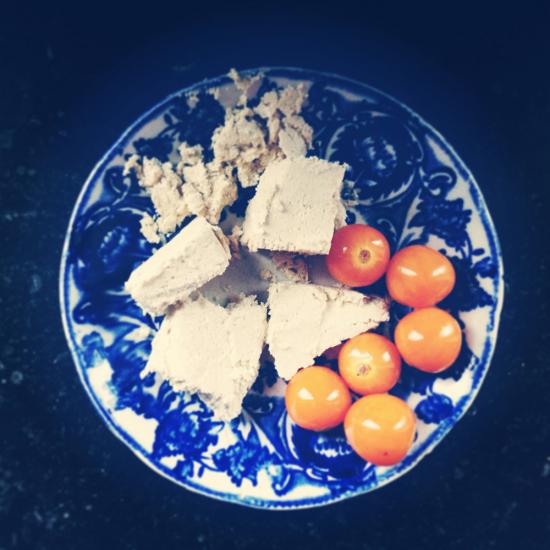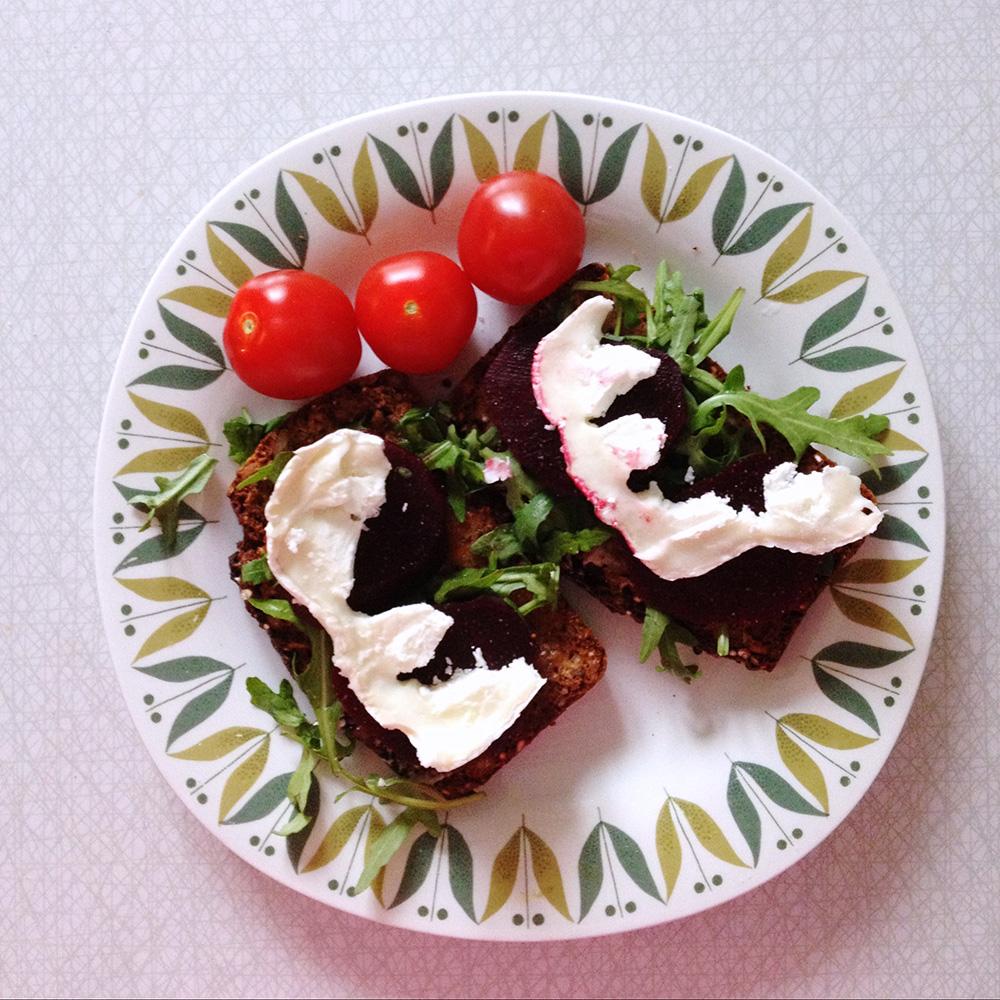 Breakfast the day after: Home made bread made of a gazillion different kinds of flour and seeds, apricots and lingonberry. On top of it: Ruccola, cold left over beet roots and goat cheese.